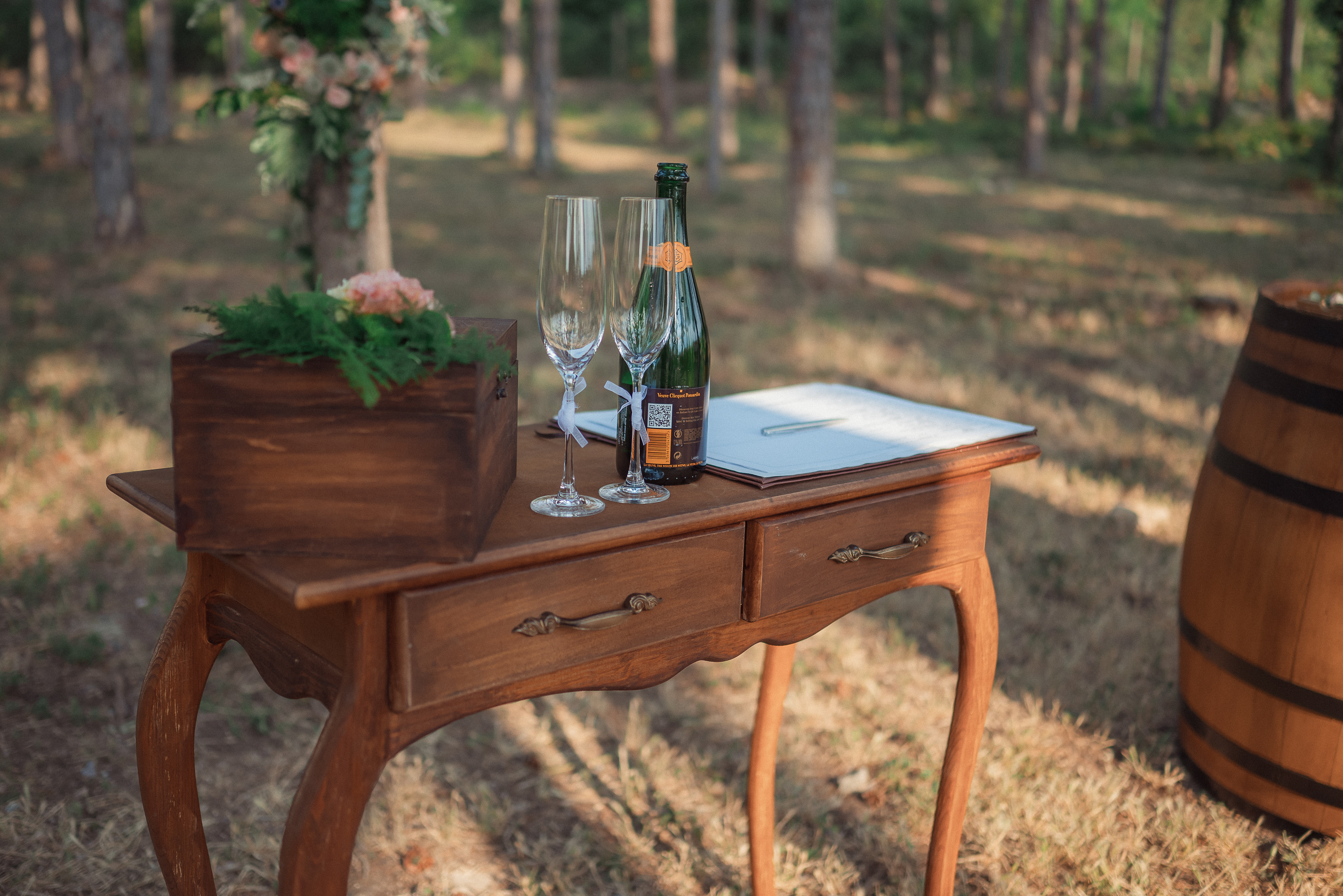 Дървена конзолна масичка, подходяща за изнесен ритуал, фотокът, подаръци и пожелания.