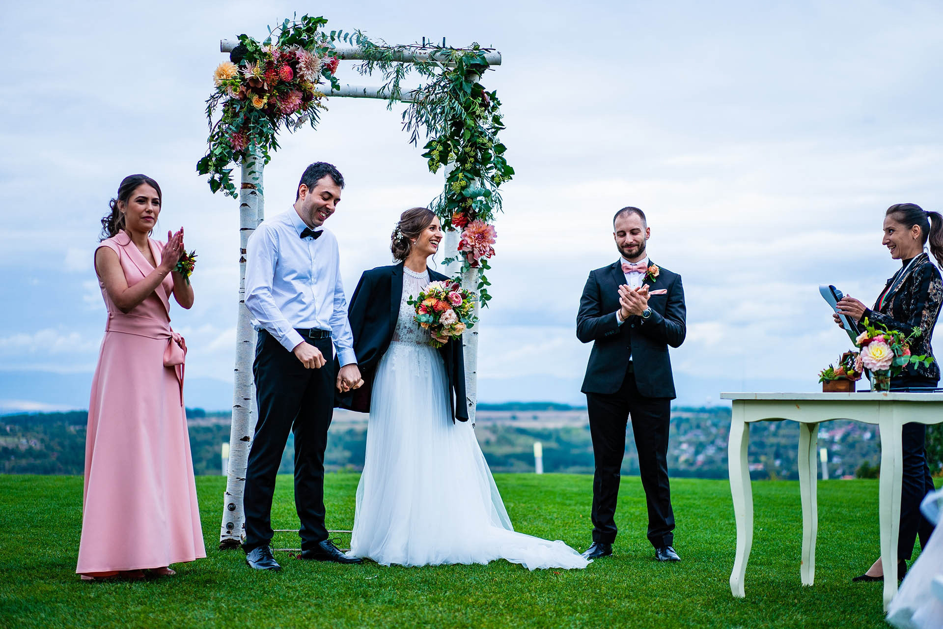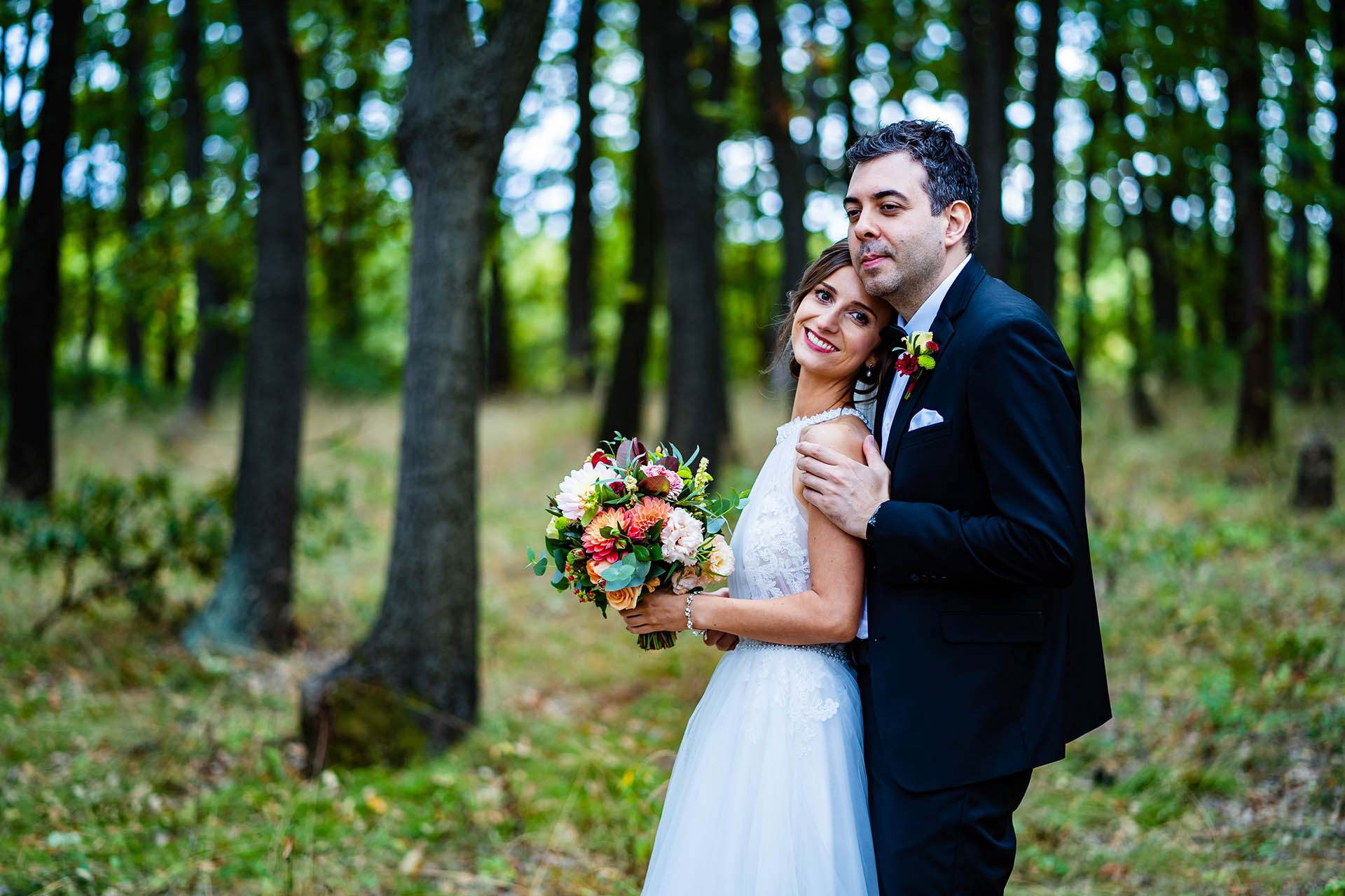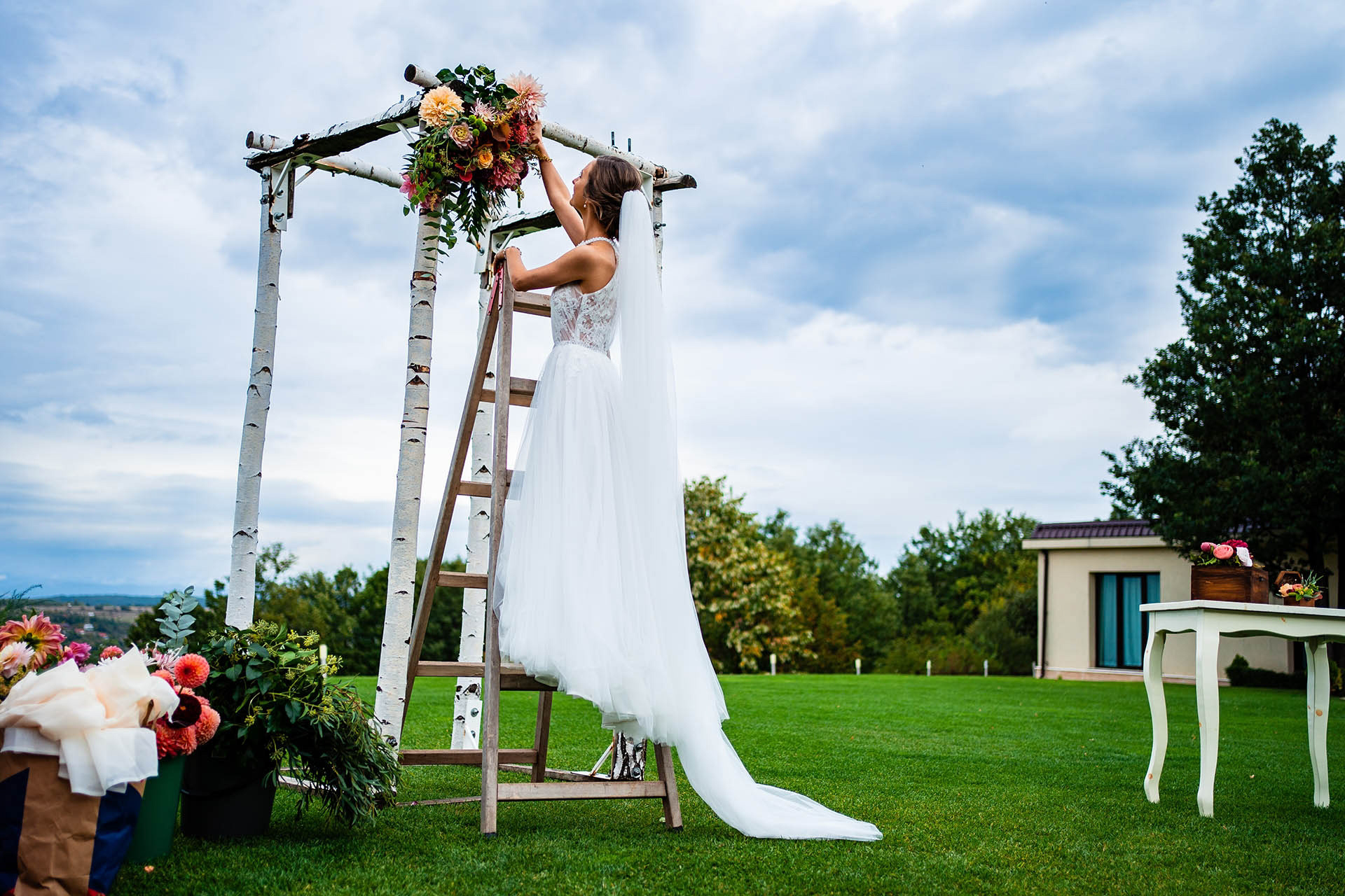 Имахме удоволствието да бъдем част от красивата сватба на Катерина и Николай в тесен семеен кръг и да сътворим за тях и скъпите им гости ефирна декорация с лек горски полъх и акцент от различни по цвят и форма далии.