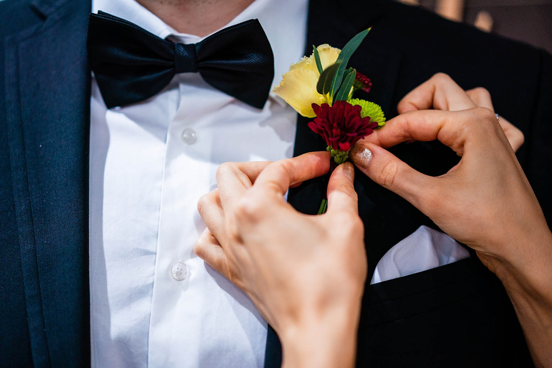 Редом с естествените цветя и зеленина в украсата включихме деликатни текстилни цветя за шампанското и чашите , както и ръчно изработени хартиети цветя  за дървената кутия за подаръци.