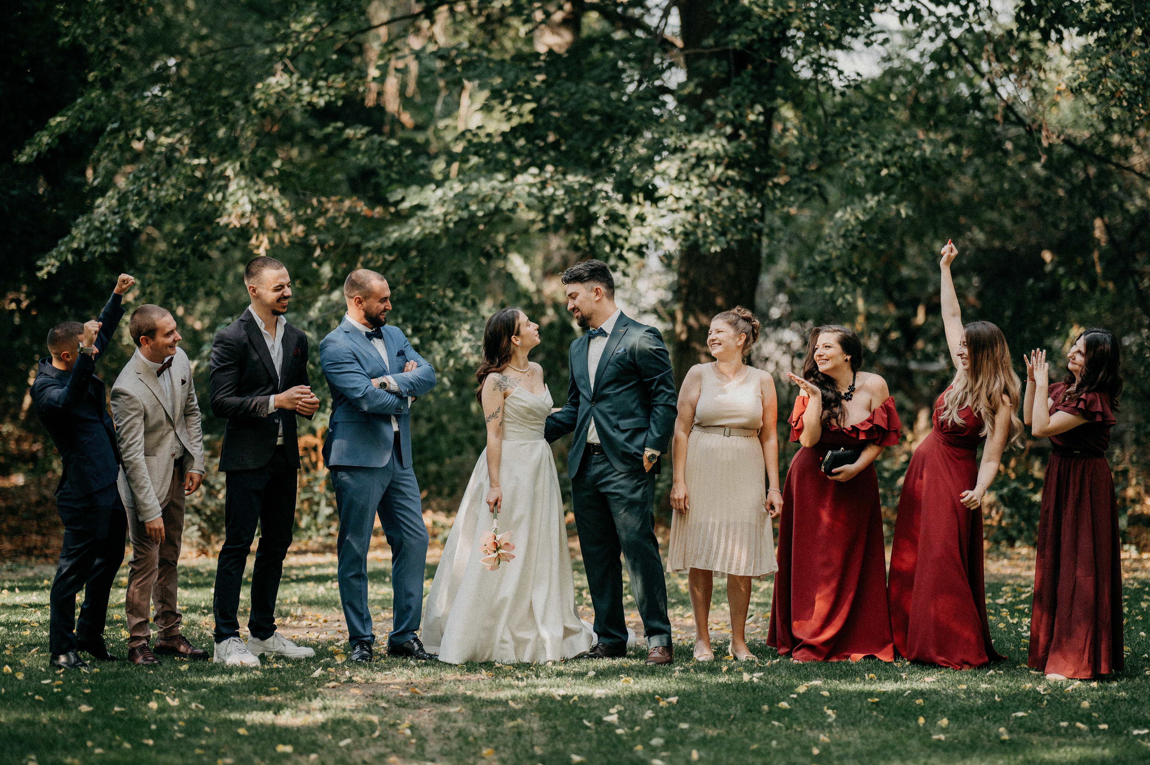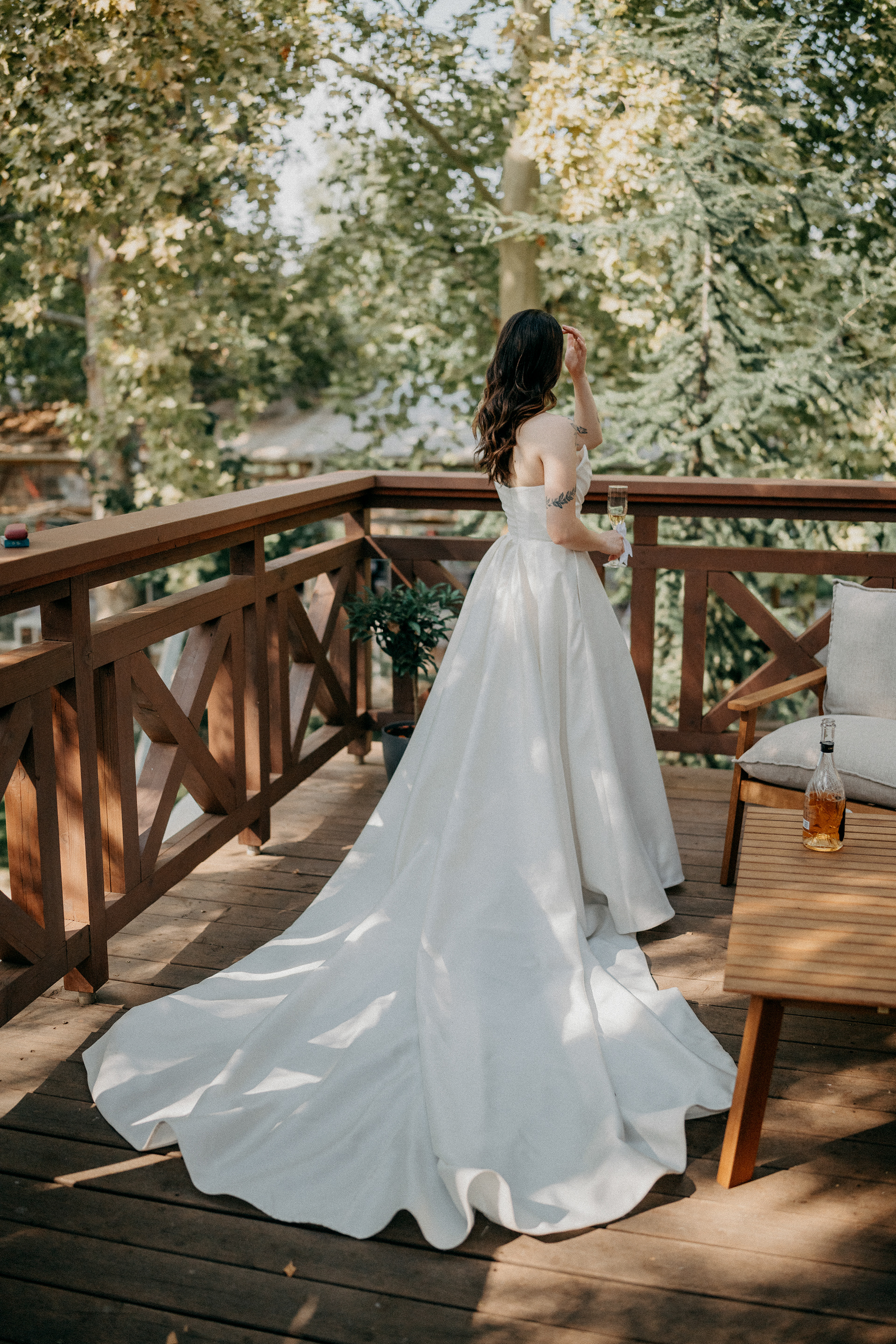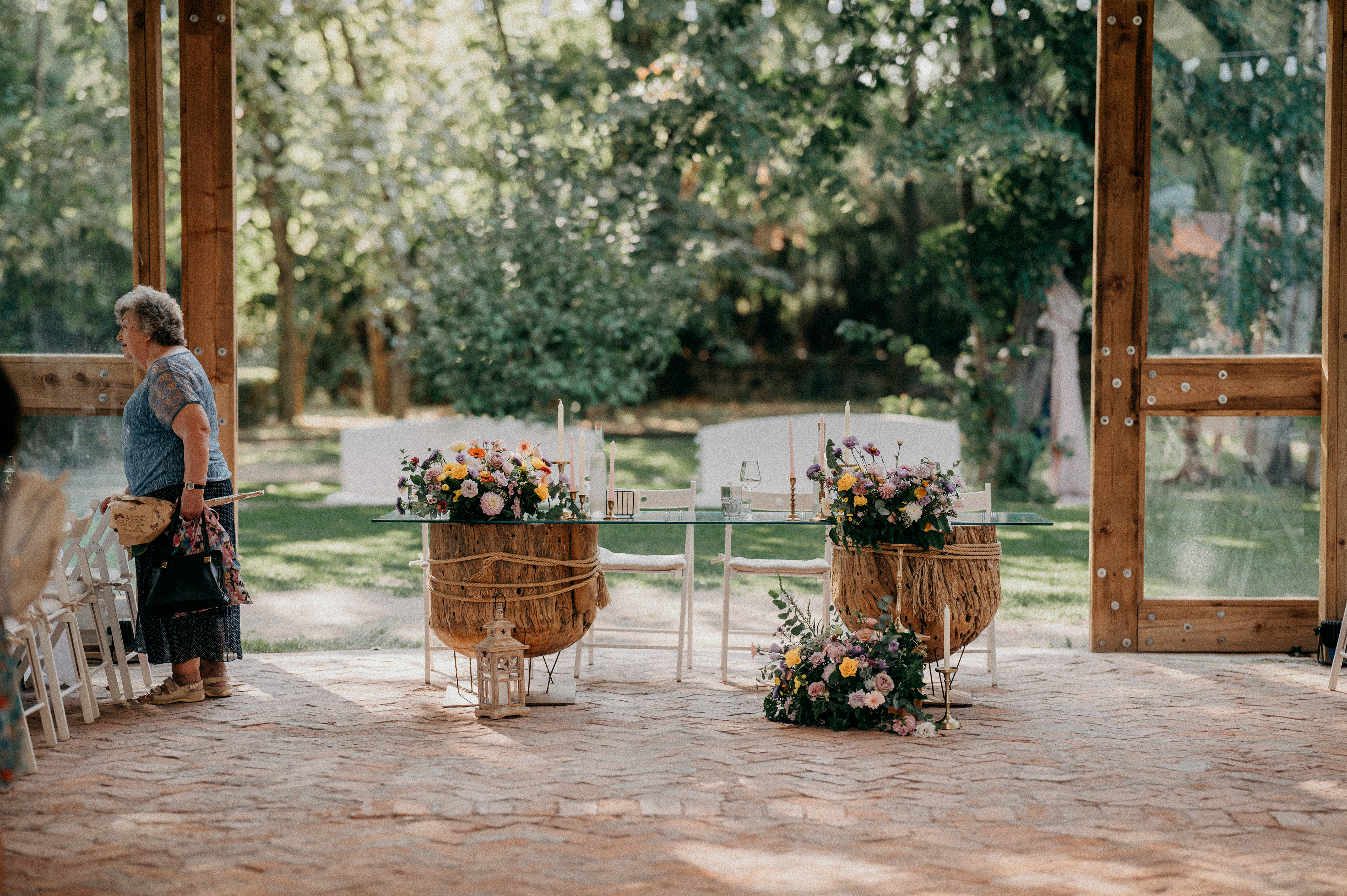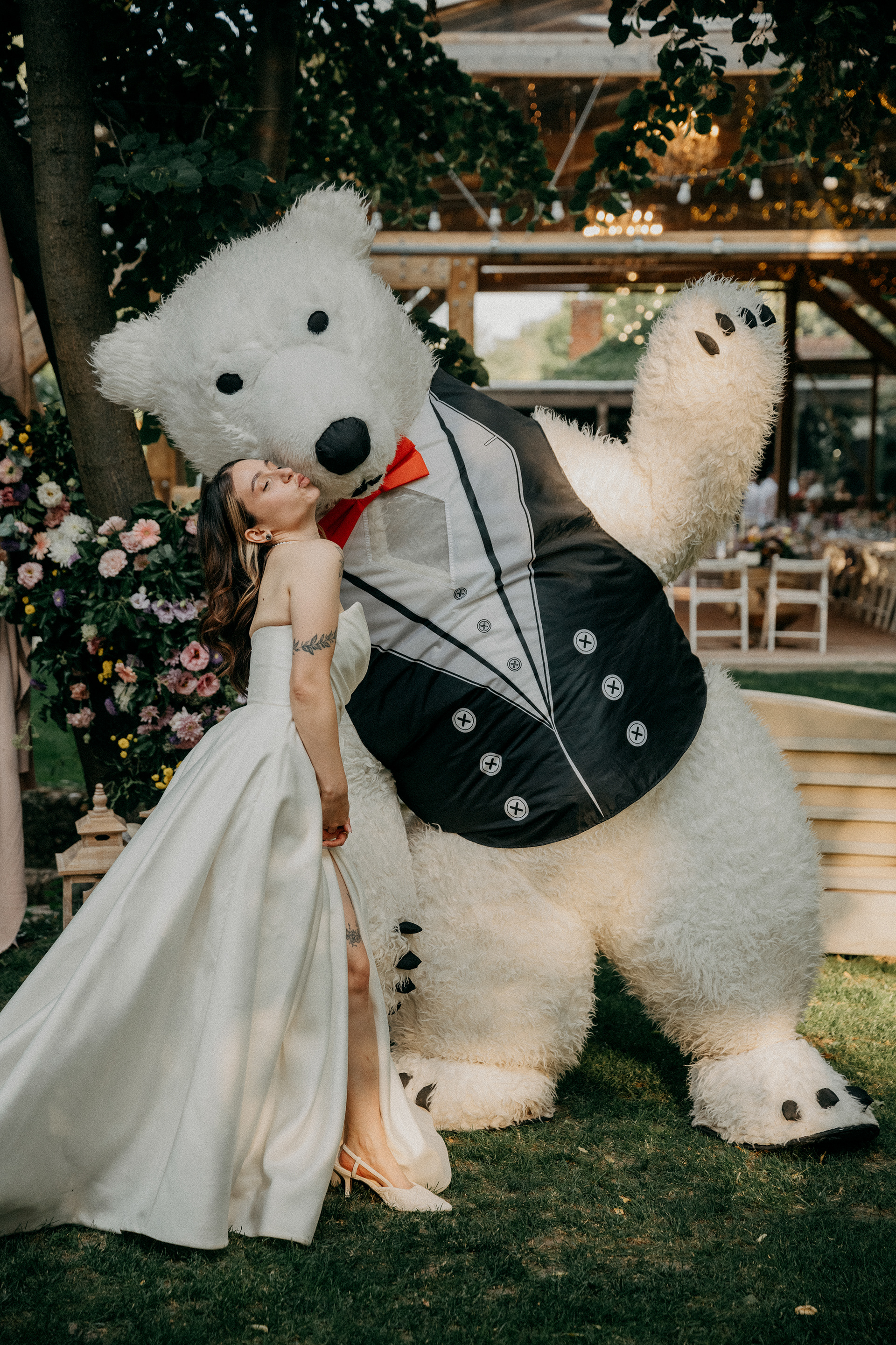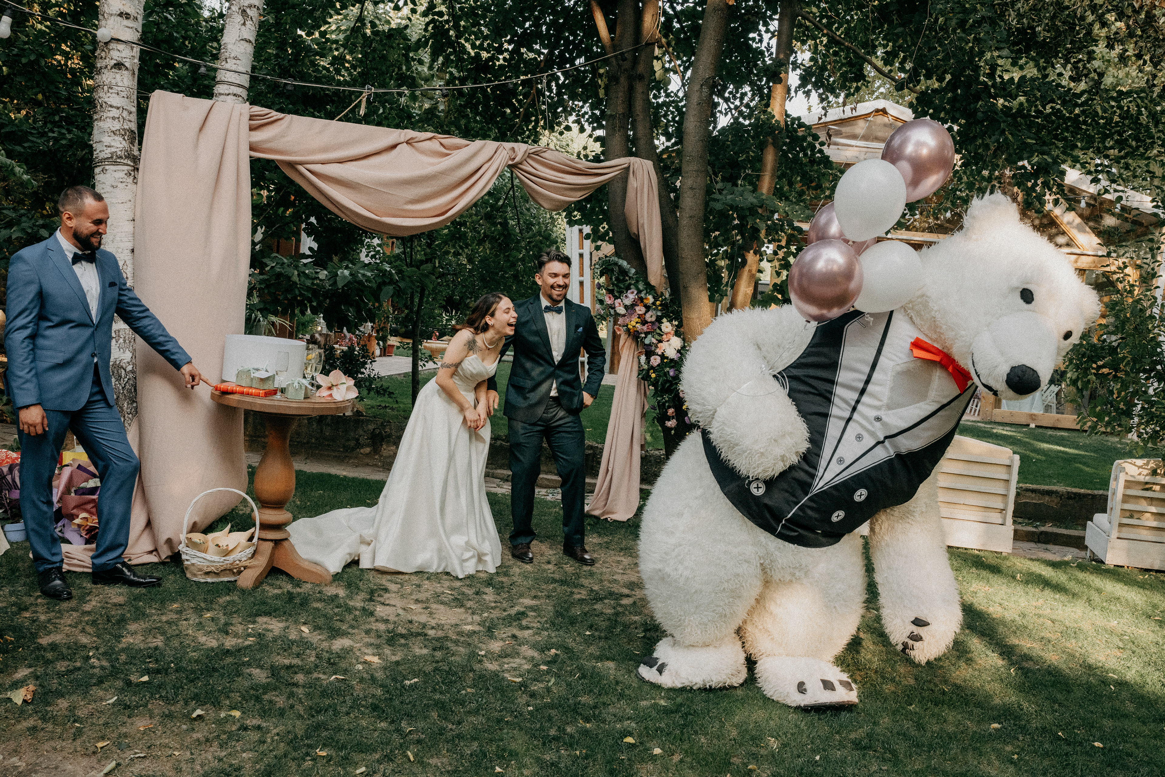 Имахме ясна концепция за ефирна декорация с пъстри цветя, изключително минималистичен и различен булчински букет, много разчупено табло за настаняване на гостите. Но когато сватбата е в гората, може изневиделица да се появи и.. мечка. Доста симпатична и с балони!