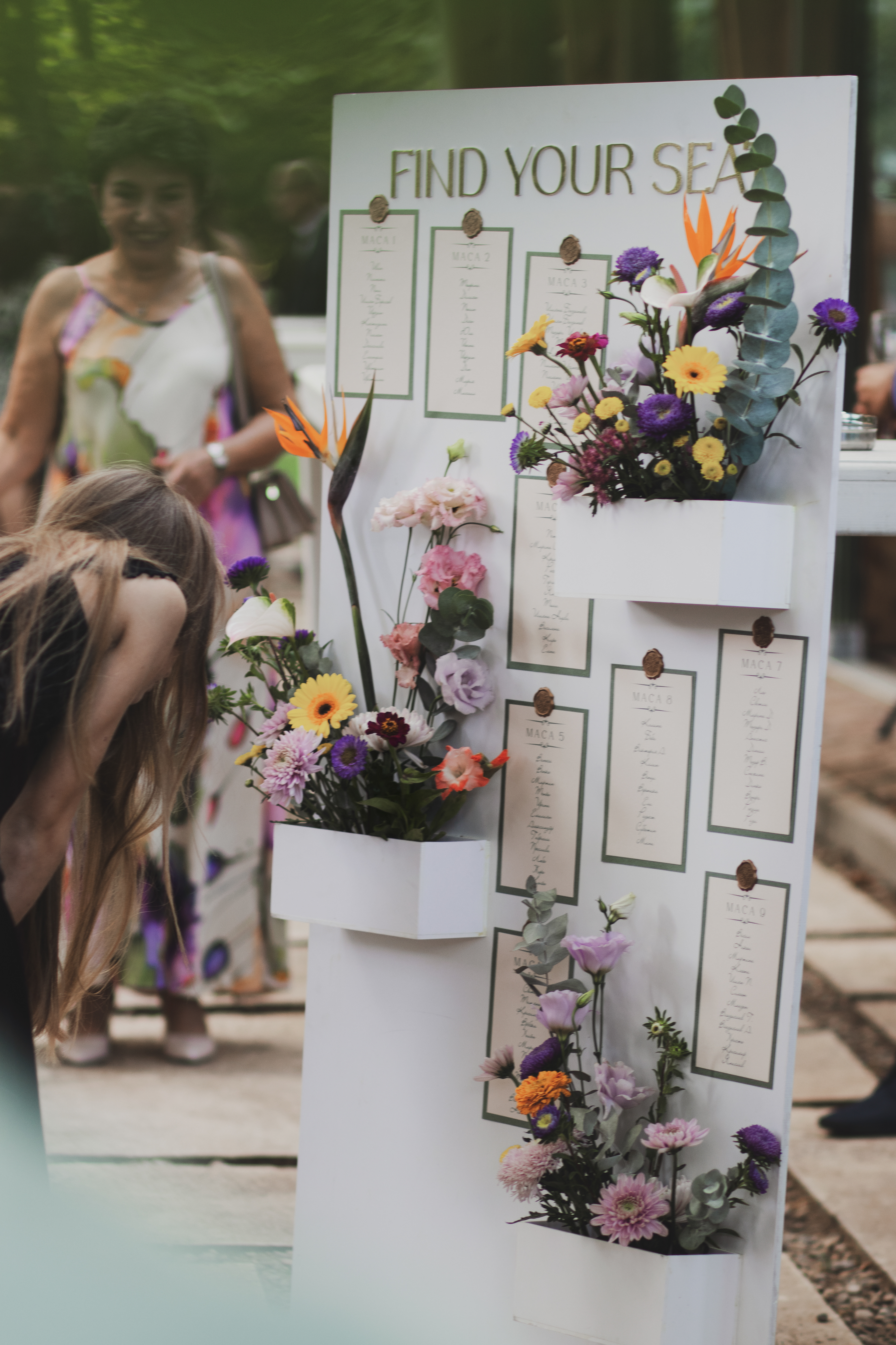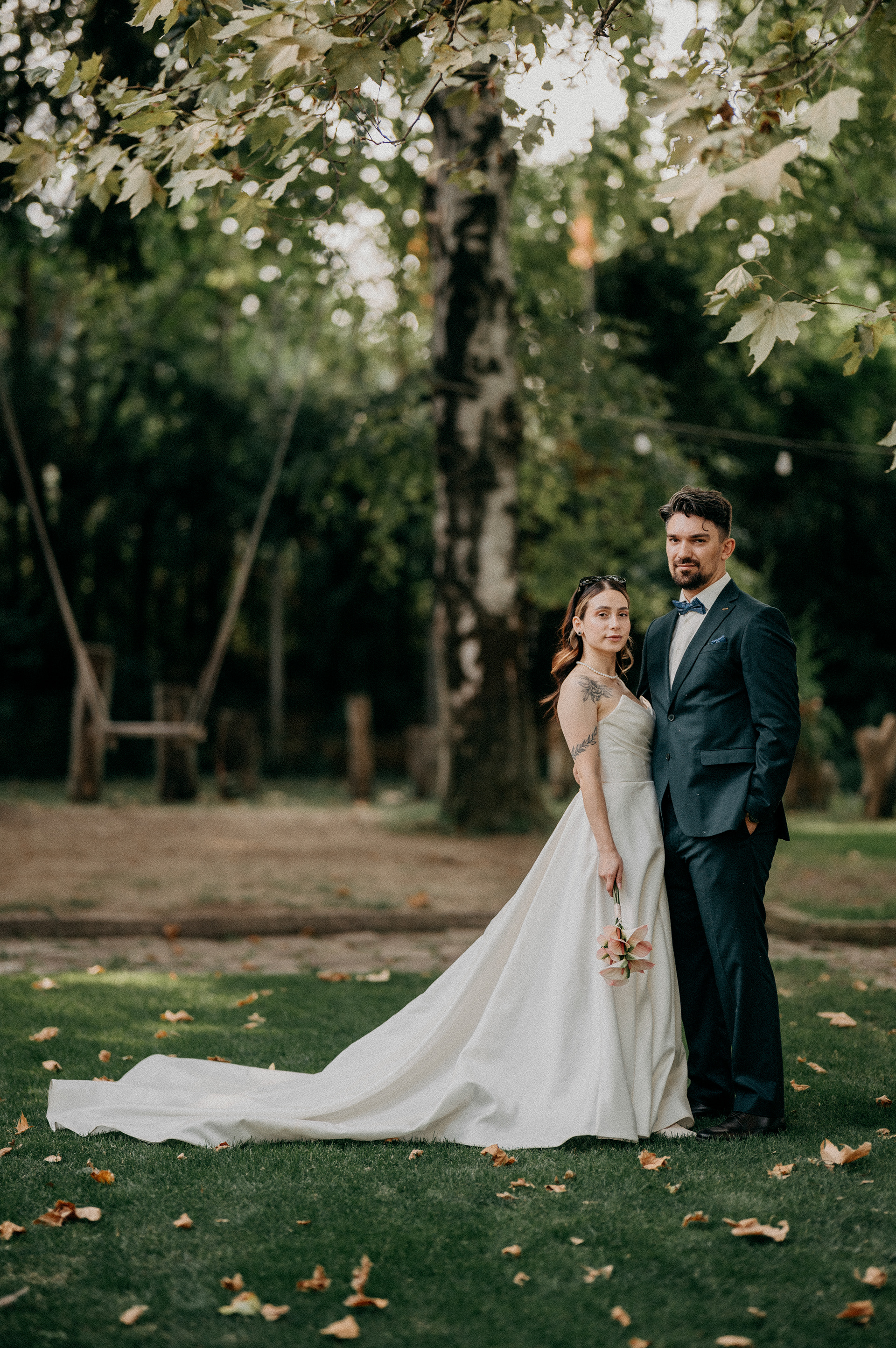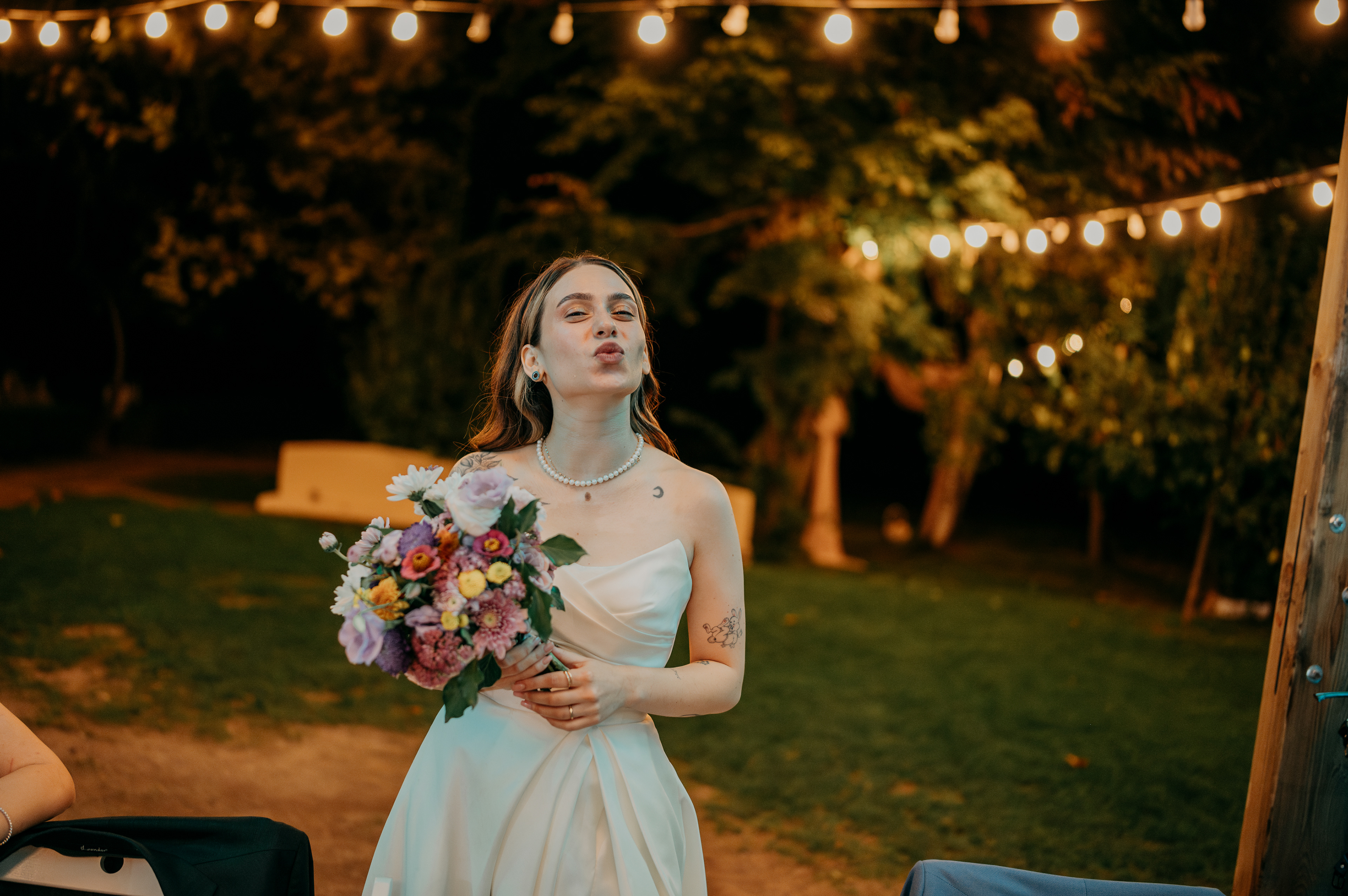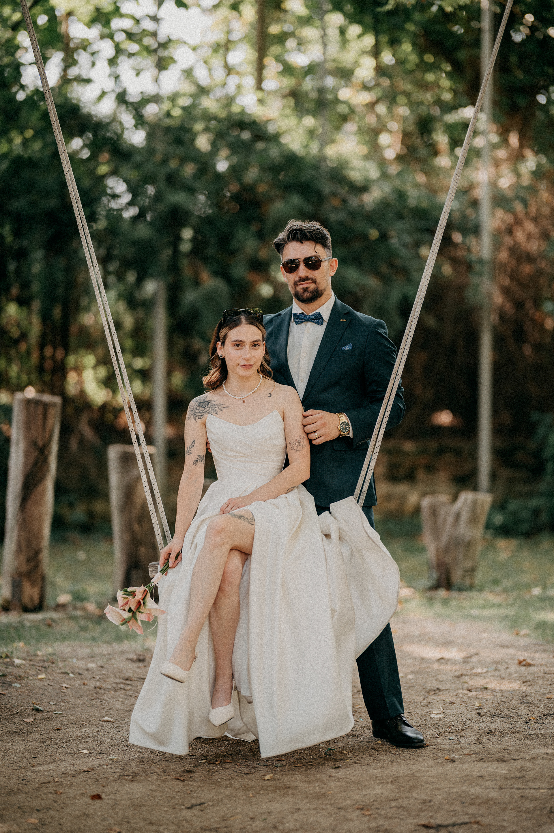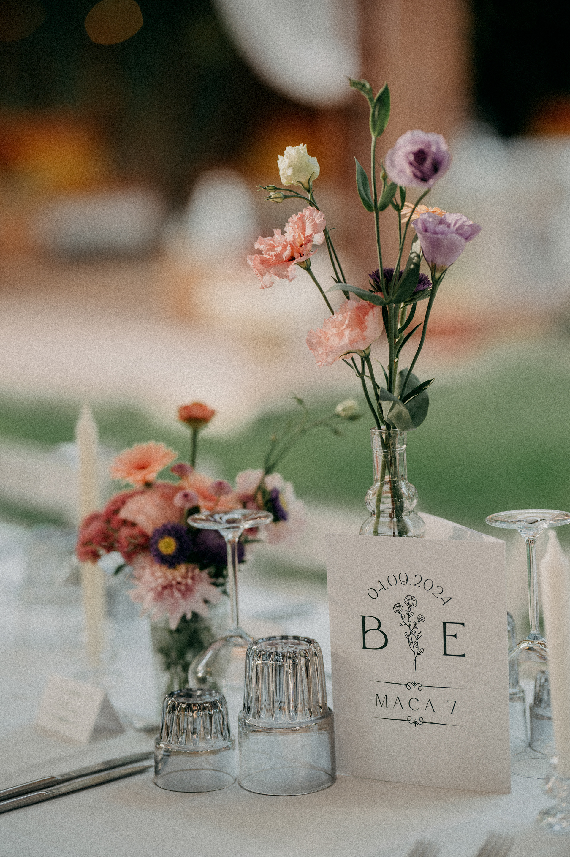 Имахме ясна концепция за ефирна декорация с пъстри цветя, изключително минималистичен и различен булчински букет, много разчупено табло за настаняване на гостите. Но когато сватбата е в гората, може изневиделица да се появи и.. мечка. Доста симпатична и с балони!