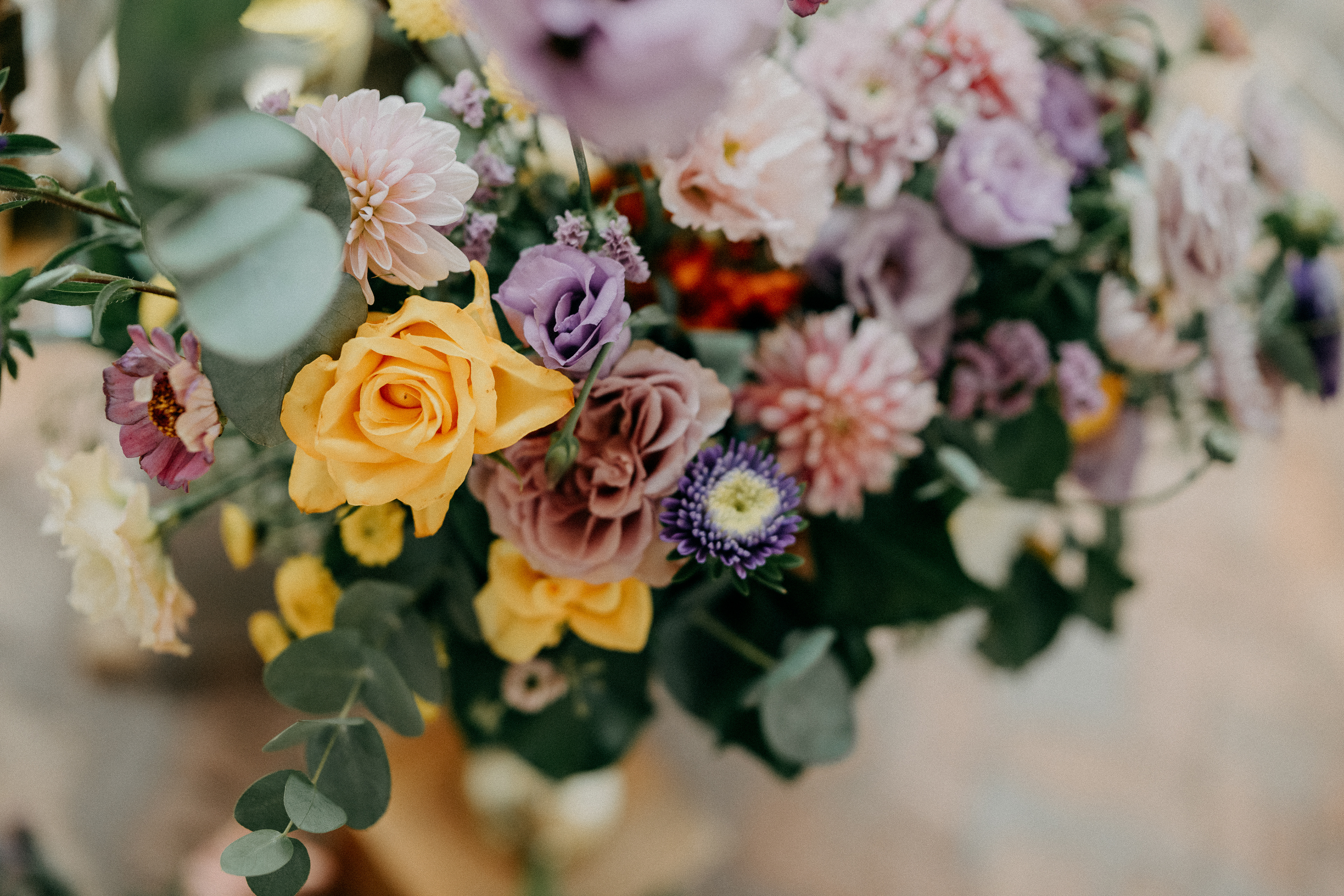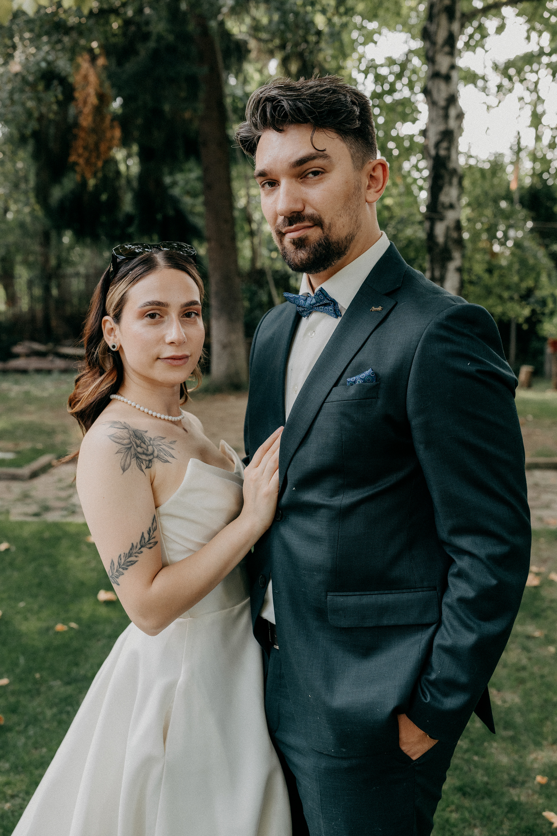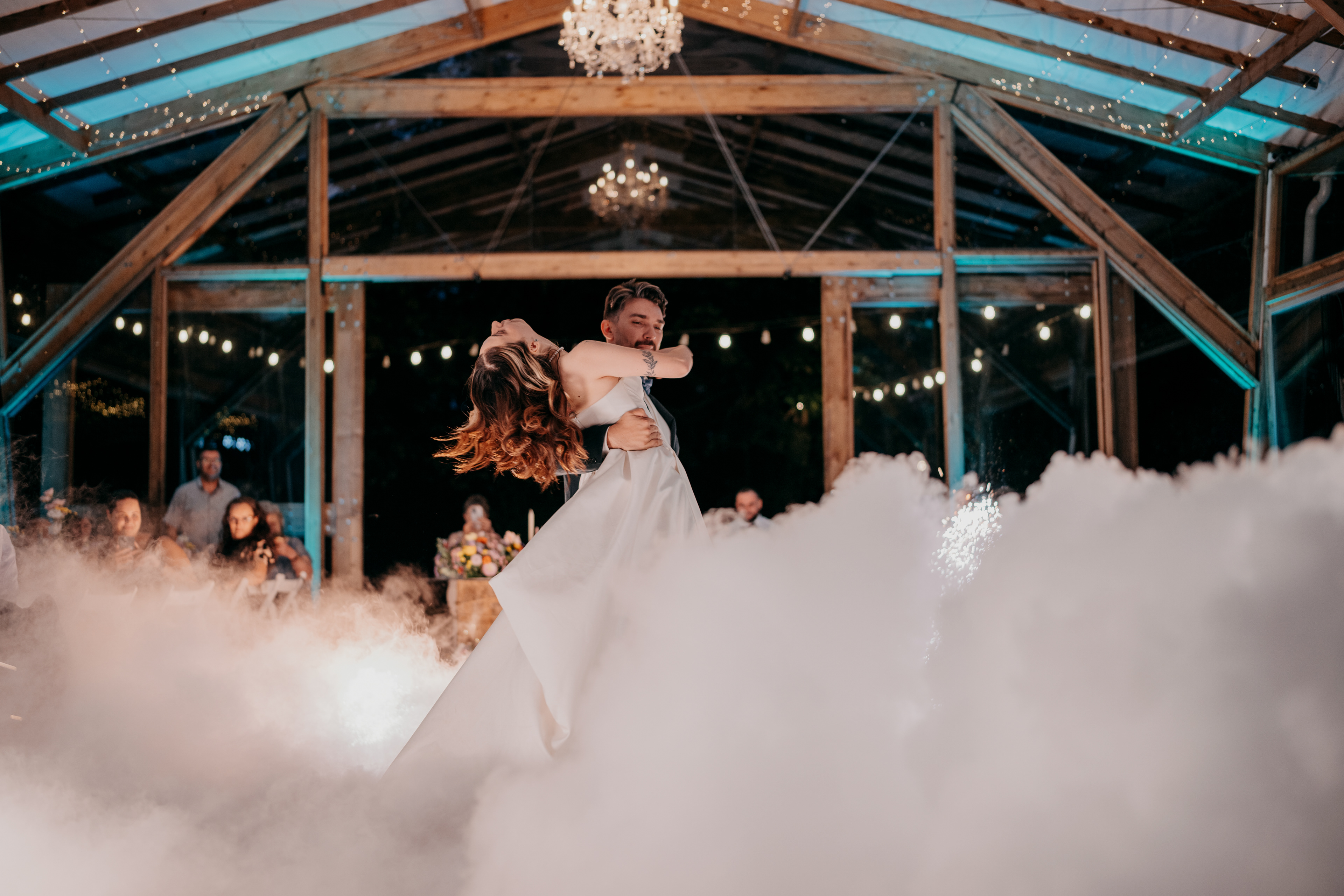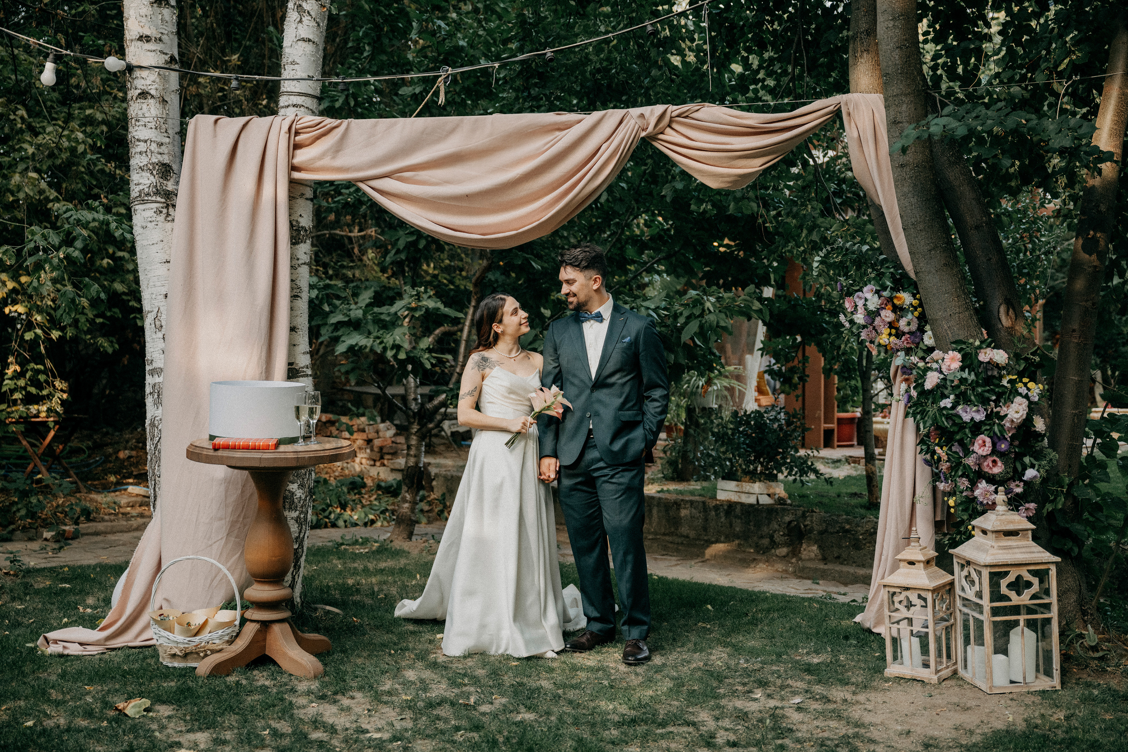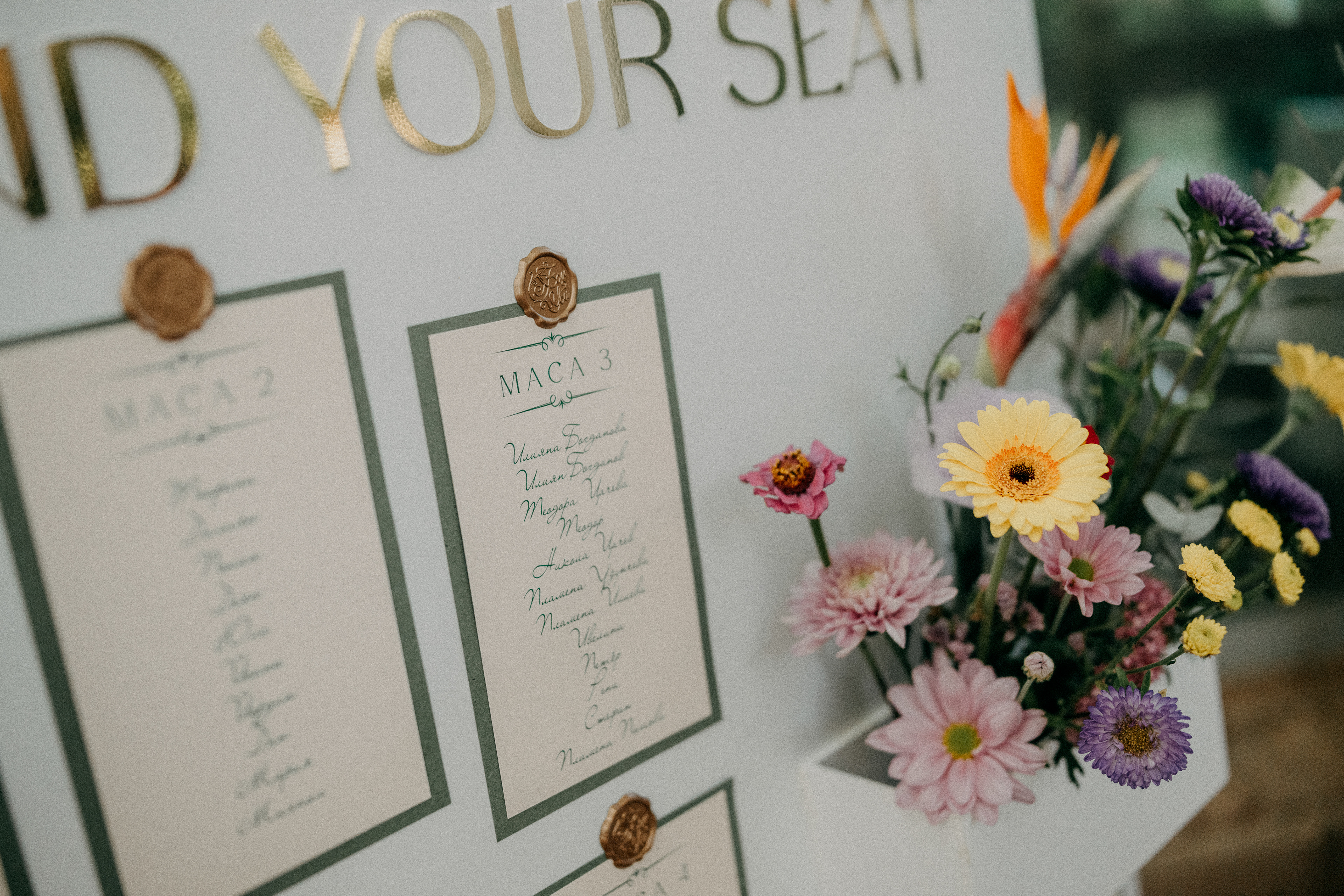 Имахме ясна концепция за ефирна декорация с пъстри цветя, изключително минималистичен и различен булчински букет, много разчупено табло за настаняване на гостите. Но когато сватбата е в гората, може изневиделица да се появи и.. мечка. Доста симпатична и с балони!