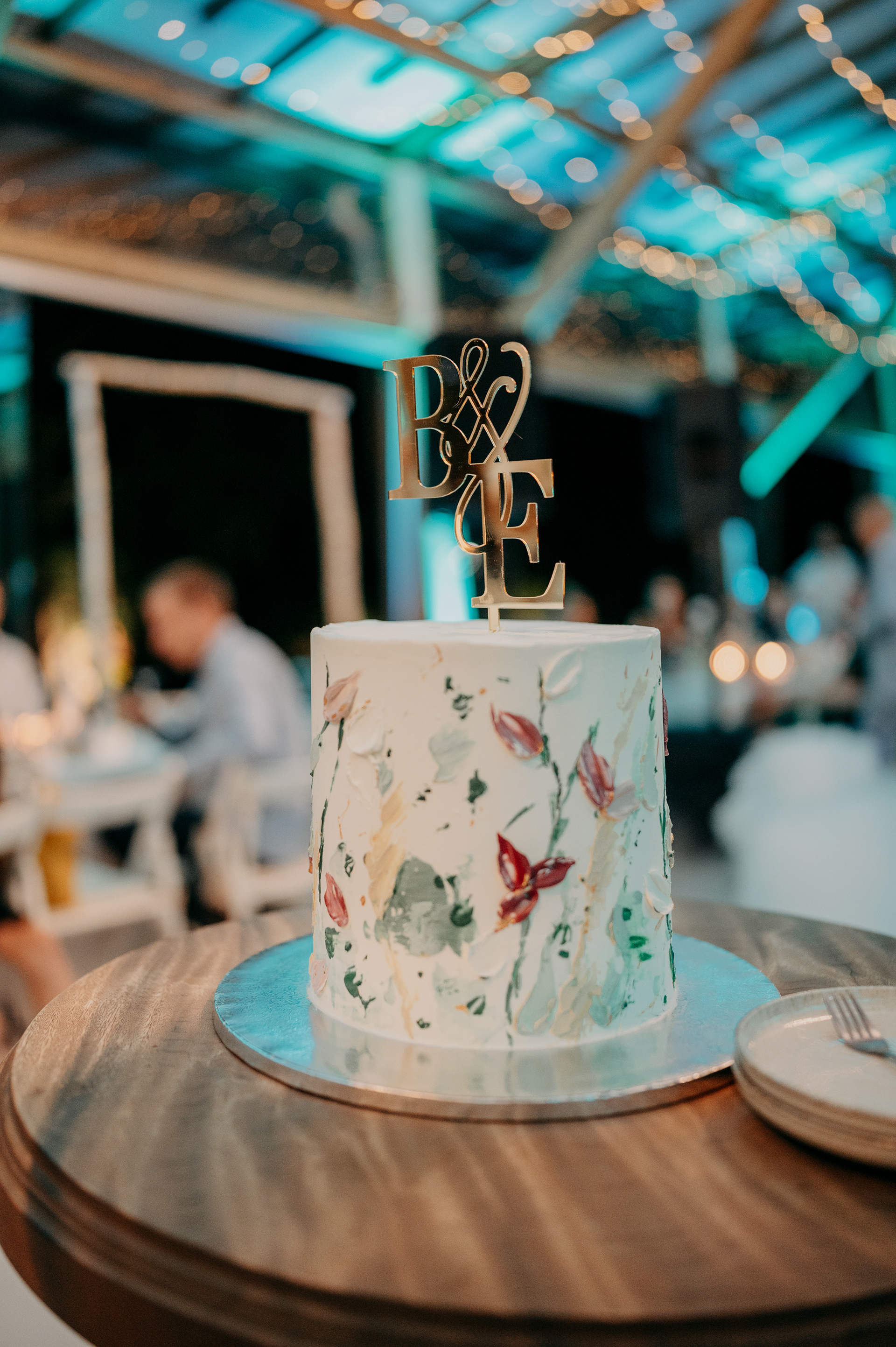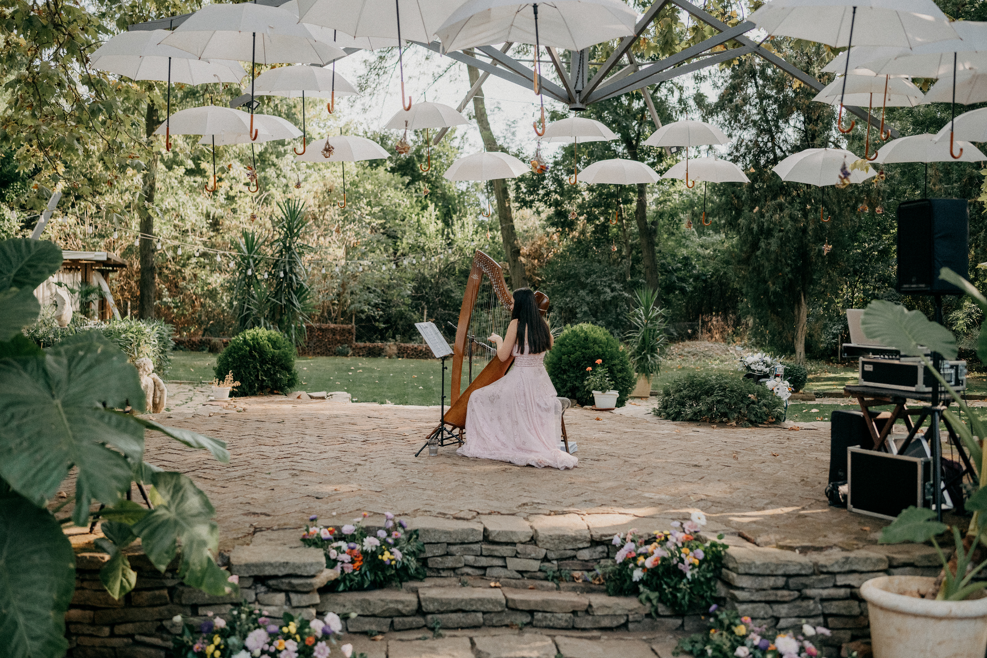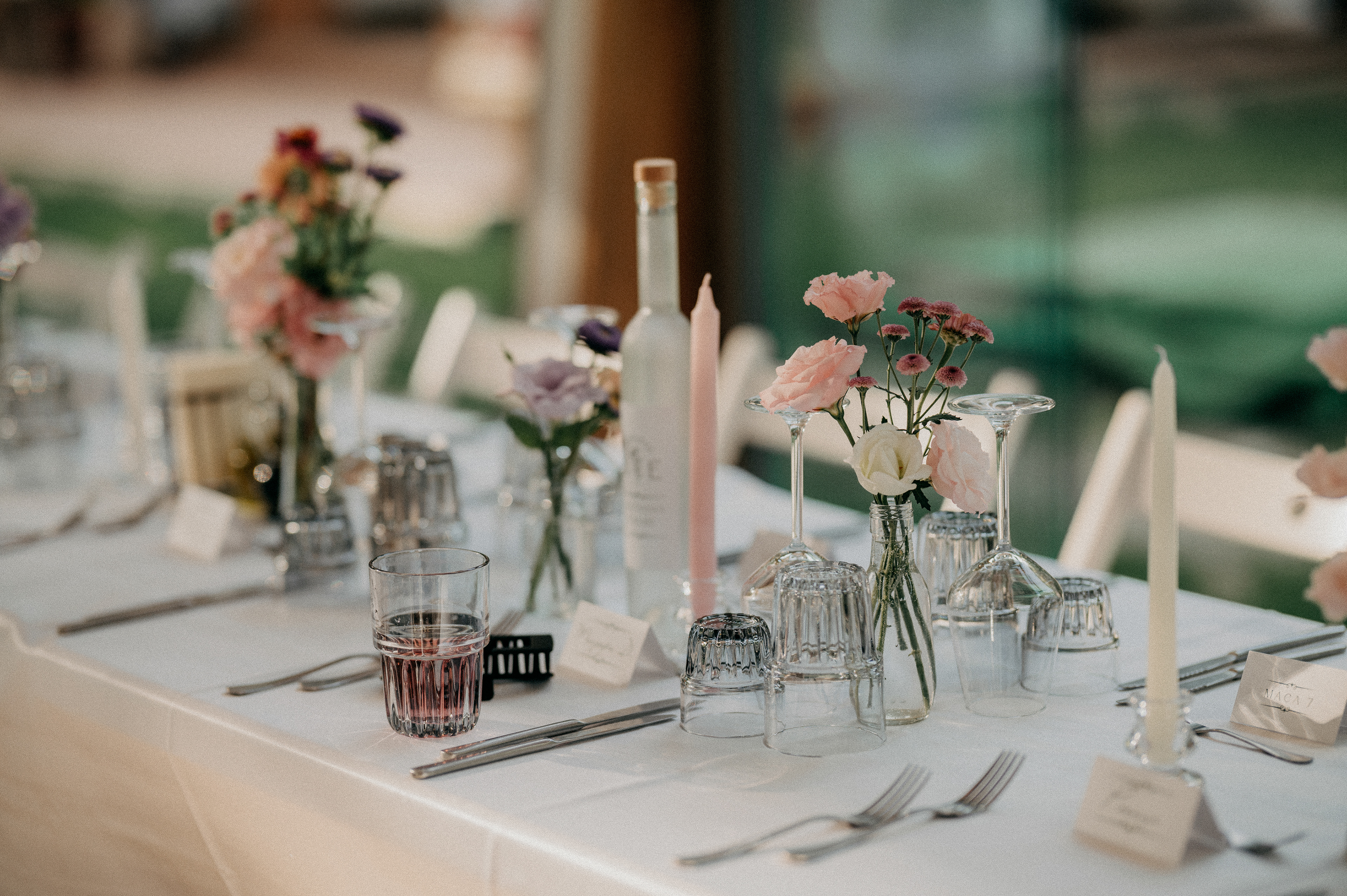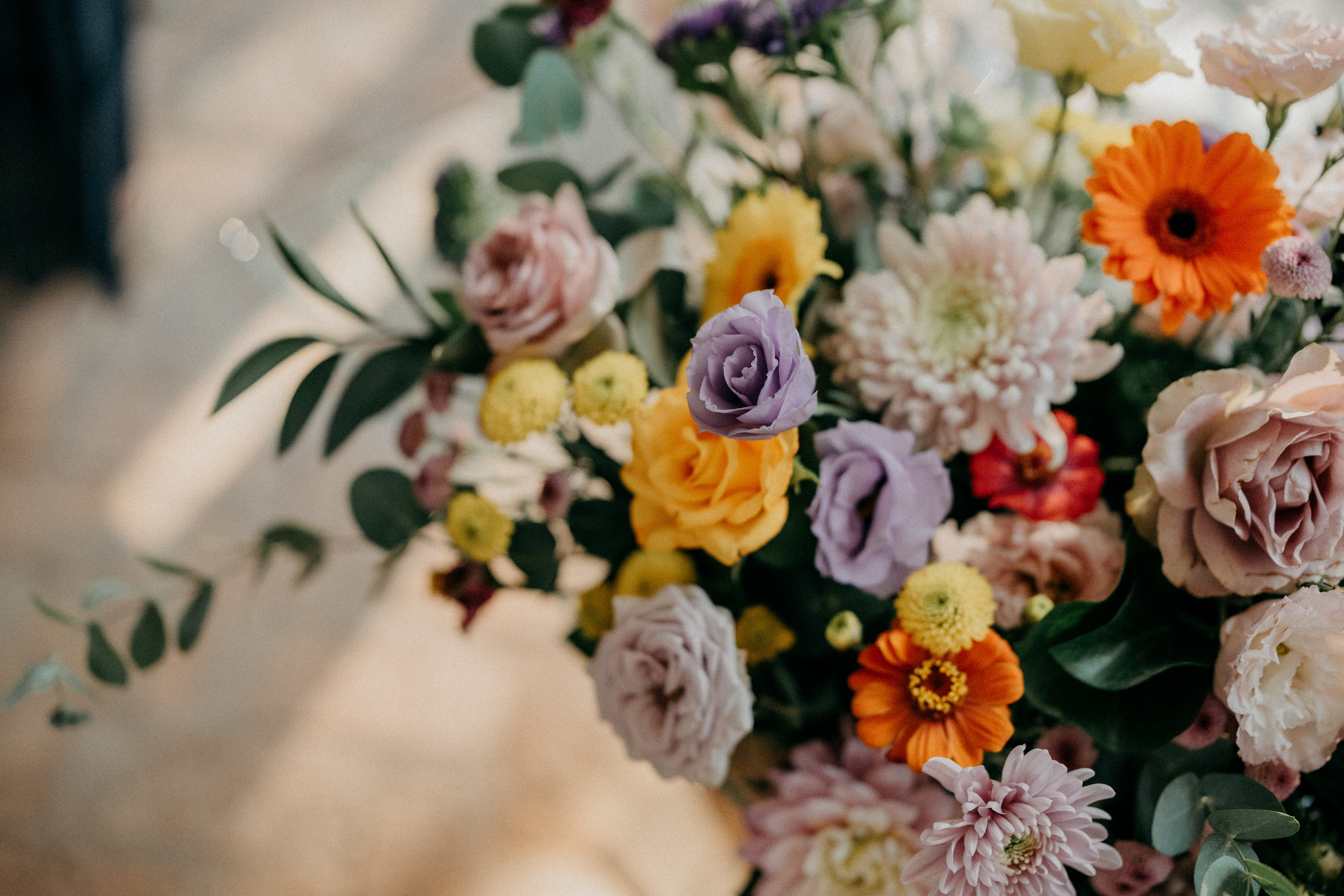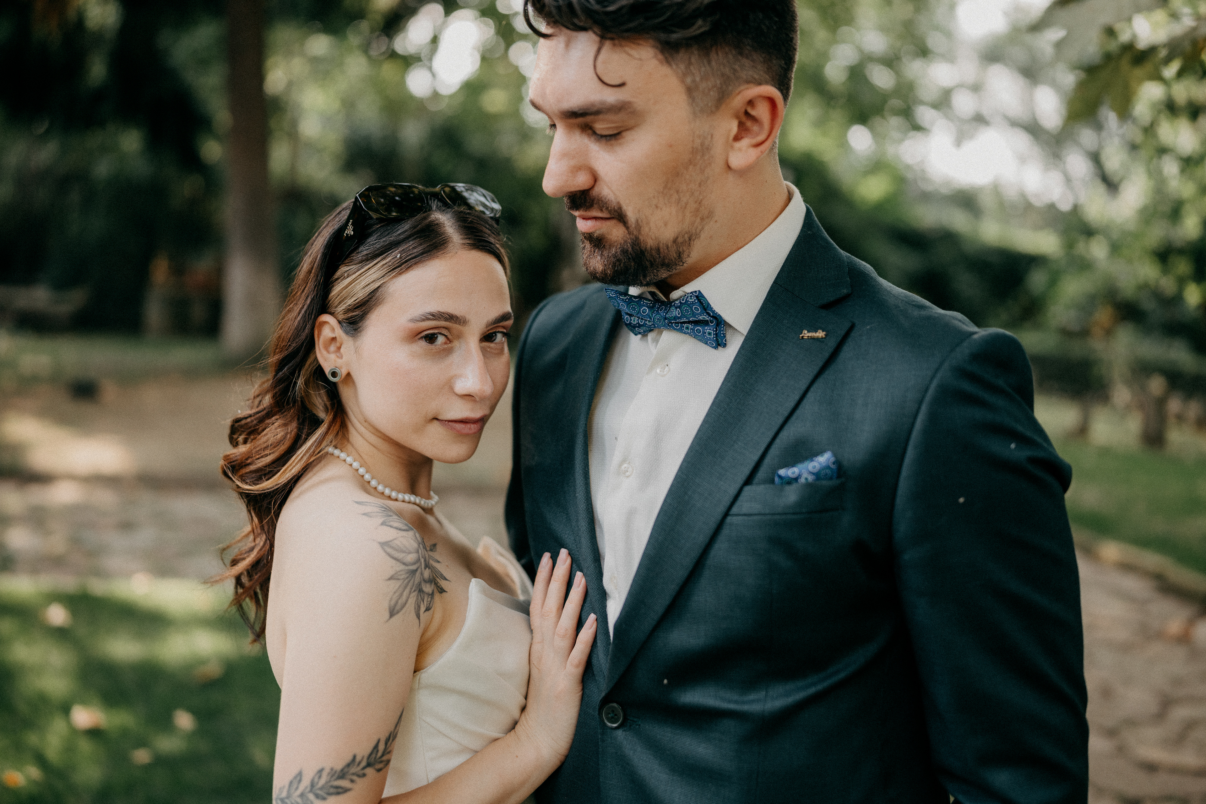Имахме ясна концепция за ефирна декорация с пъстри цветя, изключително минималистичен и различен булчински букет, много разчупено табло за настаняване на гостите. Но когато сватбата е в гората, може изневиделица да се появи и.. мечка. Доста симпатична и с балони!