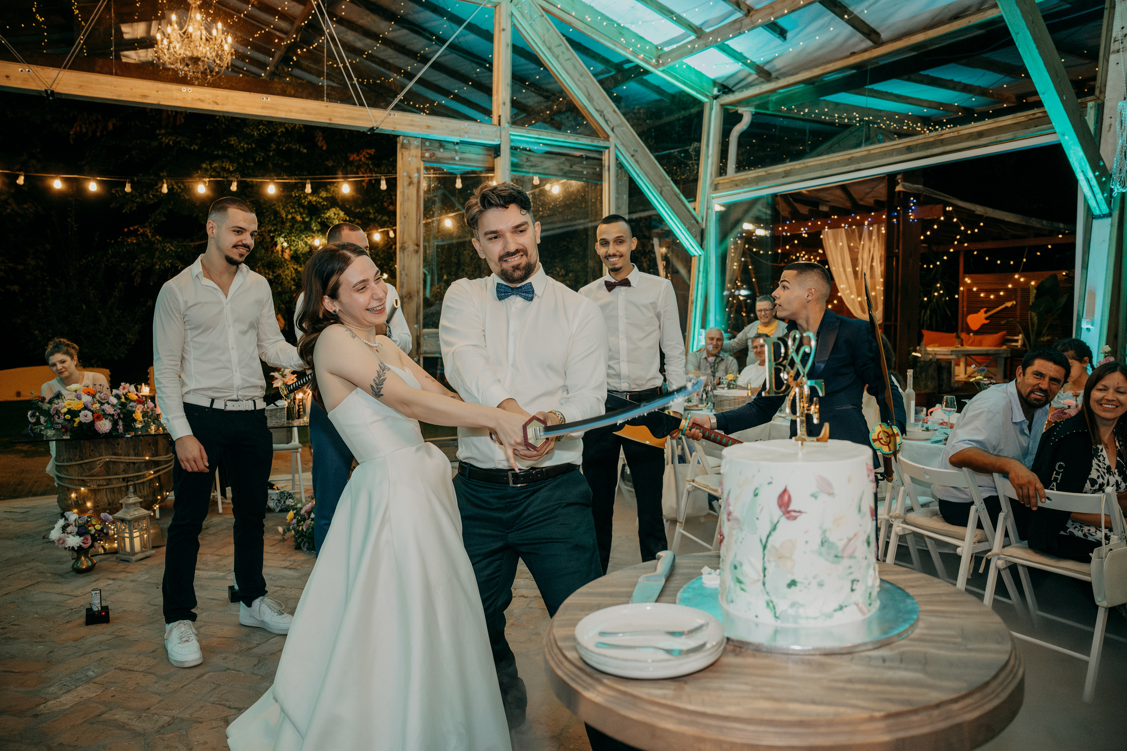 И когато ни питате има ли задължителни елементи и кое може или не може да намери своето място - сабята обичайно не е сред предложенията в ритуалите, но пък служи чудесно за рязане на красива сватбена торта.